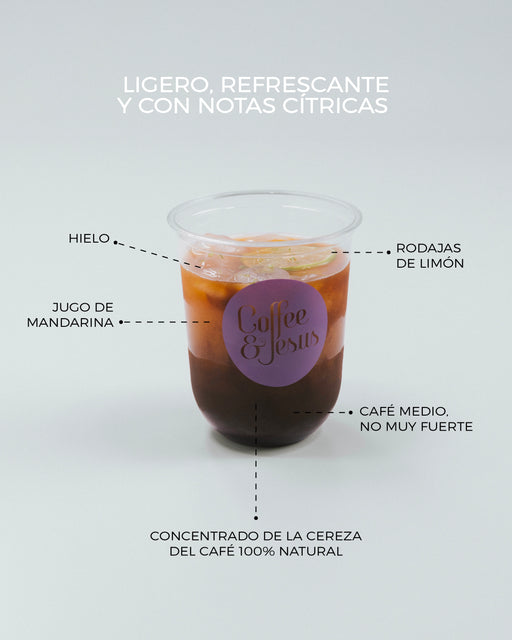 Bebida refrescante a base de café cascará con un sabor a café medio no muy fuerte *Cascará: Es un concentrado hecho de la cereza del café 100%natural.
