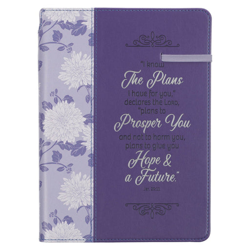 Flexcover journal with foil accents on the cover 8.5" x 5.5" x .25" approx 128 lined pages with Scripture FOr I know the plans I have for you Water...