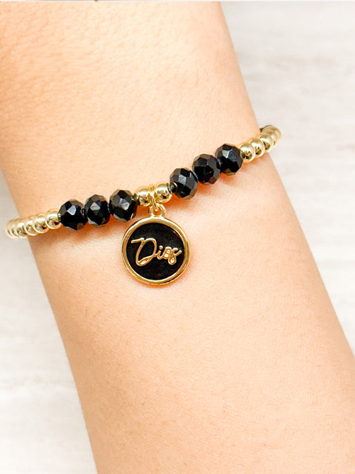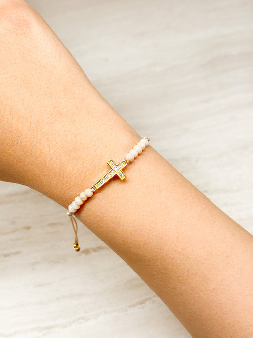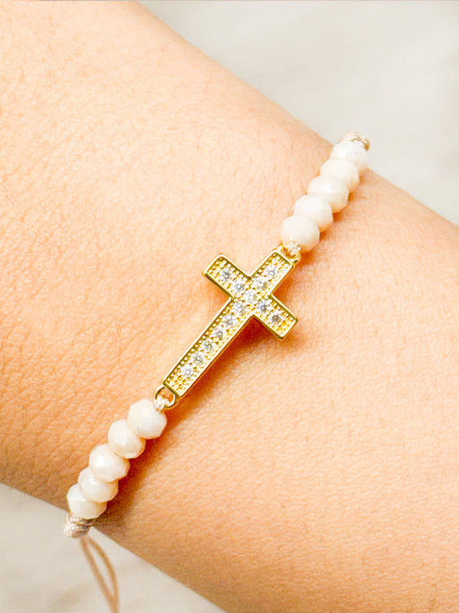 Pulsera con perlas de río y dije de cruz. Está  elaborada con mostacillas azules y negras y perlas de río. El dije es es en rodio, un materi...