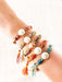 Pulseras con nudos de diferentes colores, elaboradas con hilos y perla Shell de fantasía fina.
