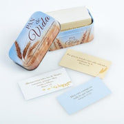 Las 101 tarjetas bíblicas de doble cara están envueltas y forradas con plástico en un paquete transparente dentro de una caja decorativa de regalo. El versículo Juan 6:35 aparece en la parte trasera de la caja.