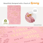 Regocíjate en la bondad de Dios mientras derramas tu gratitud en el diario clásico de piel sintética rosa Mi fuerza y mi canción con cierre de cremallera. Este magnífico diario transmite un hermoso mensaje del poder sustentador de Dios.