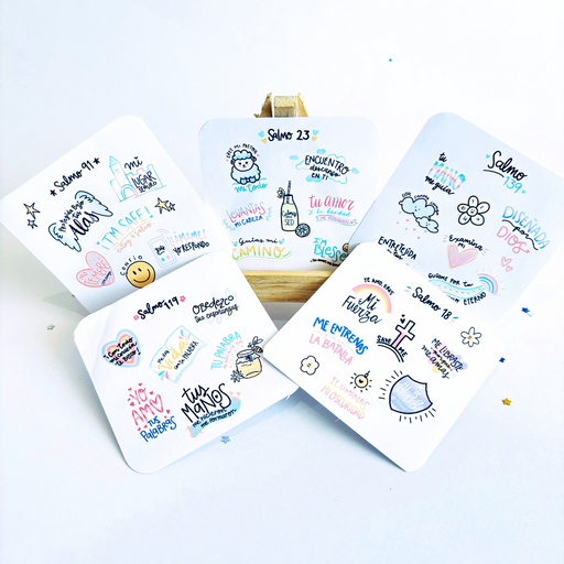 Hermoso set de 5 láminas ilustradas con diferentes capítulos del Libro de Salmos. Cada diseño está creado para inspirarte y recordarte las promesas...