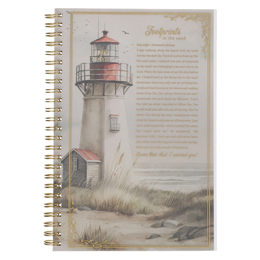 Encuentra consuelo en cada página con este cuaderno inspirado en el poema Footprints in the Sand y la promesa de Dios. Portada con diseño de faro...