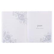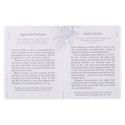 El fondo azul marino del devocional de tapa blanda está adornado con dos rosas rosadas delineadas en papel de aluminio en las esquinas opuestas. El título está sostenido por un fino marco dorado y se presenta en letras blancas en un diseño de varias fuentes.
