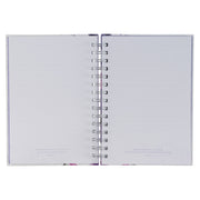 Este diario de tapa dura presenta una portada que imita el traslape pintado de blanco. Las flores de color rosa y púrpura de la acuarela decoran la encuadernación en el lado izquierdo, y las letras pequeñas se alternan con fuentes.