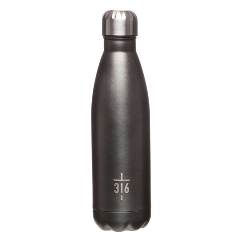 La botella de agua cruzada John 316 viene en un color carbón mate y acero inoxidable, y es una botella premium de doble pared, sellada al vacío, creada para el aislamiento en frío o en caliente durante todo el día. El diseño "3:16" se presenta en la parte inferior de la botella de agua John 316.