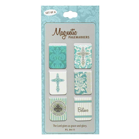 Los marcadores de páginas magnéticos cristianos Believe, Grace And Glory vienen en un paquete de 3 con 6 marcadores de página en cada uno y son de color menta y crema con un diseño moderno. Dos de los marcadores de páginas cristianos presentan el versículo del Salmo 84:11, "El Señor nos da gracia y gloria" y la palabra "Creer", mientras que otros dos marcadores de páginas inspiradores muestran una imagen conmovedora de una cruz. Los diseños de moda de flores y rayas de menta y crema se trasladan a la parte posterior de los marcadores cristianos.