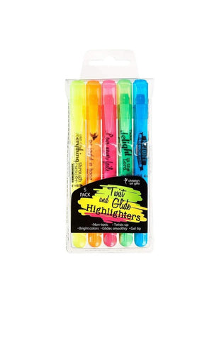 ¡Estos resaltadores Twist & Glide se deslizan sobre el papel como la mantequilla! No se filtre a través de la página, solo colores vivos para acentuar las palabras importantes. Barra de gel no tóxica con movimiento de alimentación por torsión. ¡El tamaño fácil de sujetar significa que no hay que estresarse ni calambres en las manos ocupadas! El juego incluye 5 colores (azul, amarillo, verde, rosa, naranja), cada uno con un verso de las Escrituras especialmente seleccionado impreso en negro en el barril. Empaquetado en una funda de PVC.