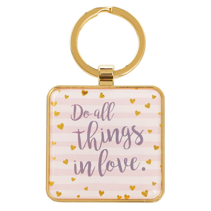 El versiculo en el llavero de metal Do All Things in Love es un recuerdo de hacer las cosas con amor. Este llavero brillante te ayudará a recordar que a pesar de los imprevistos del día, estamos llamados a responder a todo con amor.