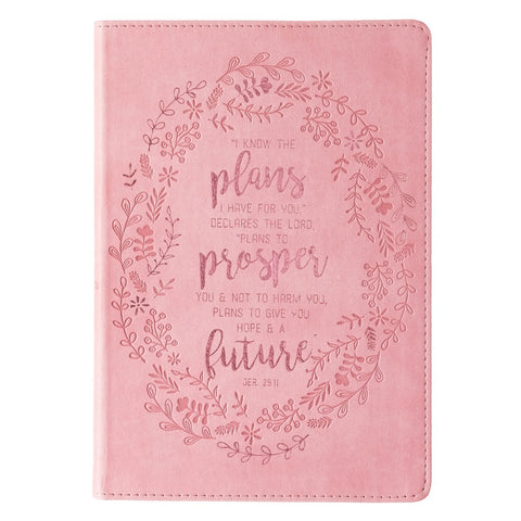 The smooth pink faux leather cover is debossed with a floral leaf wreath encircling the complete Scripture verse from Jeremiah 29:11.
